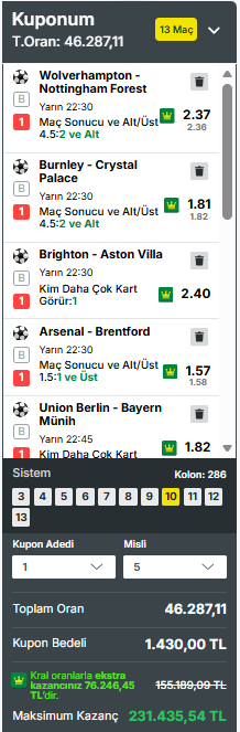 🎯  Günün Sistem Kuponu / Toplam Oran: 46.287